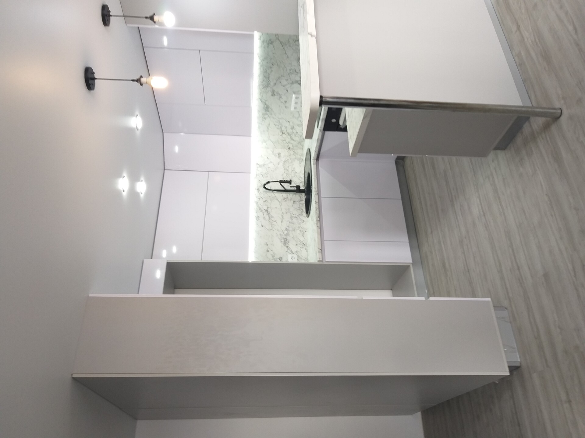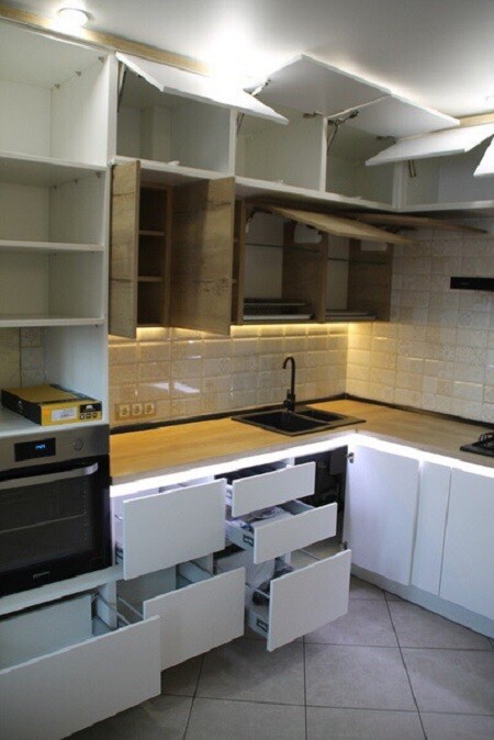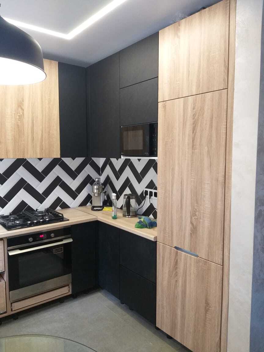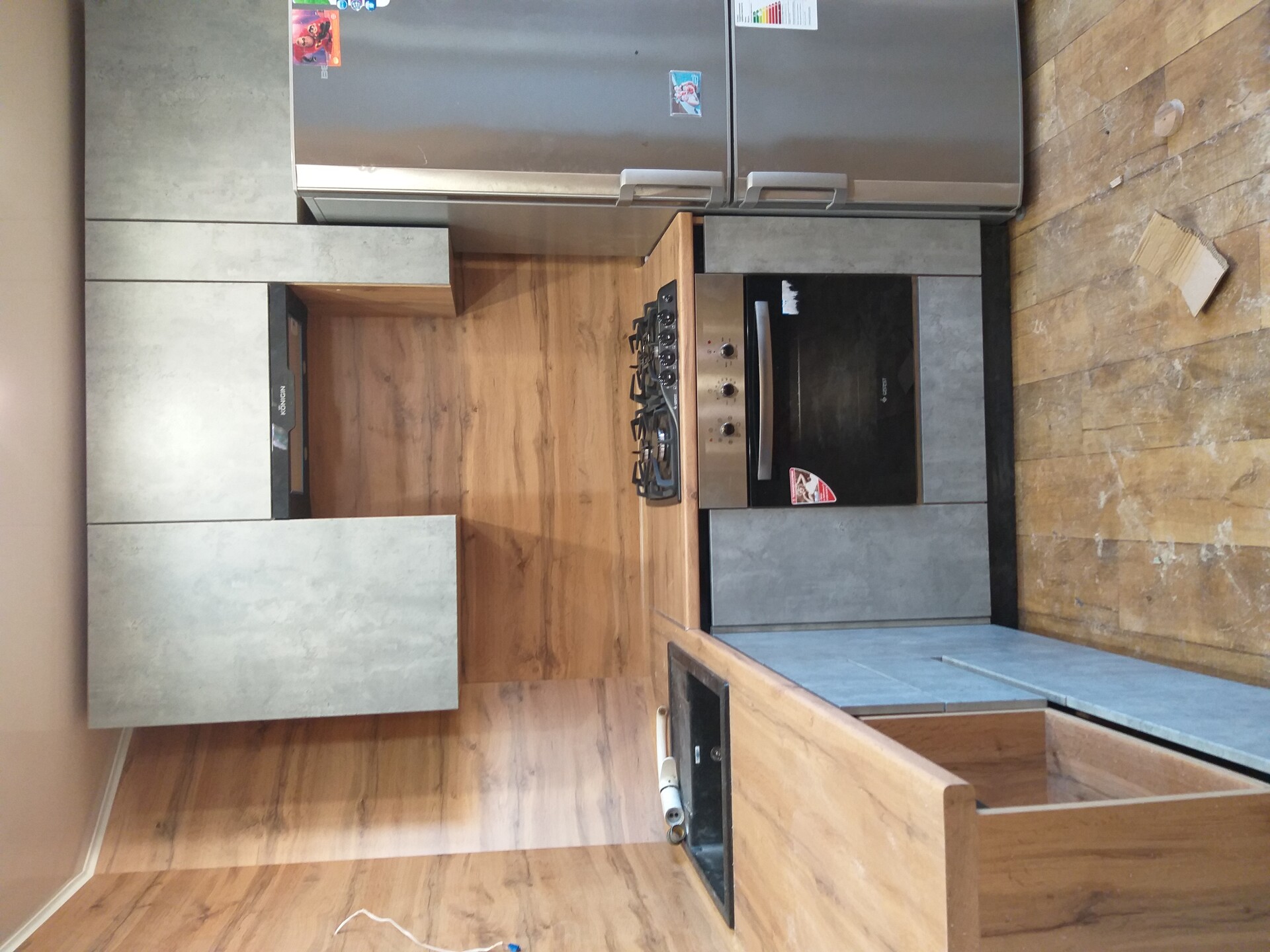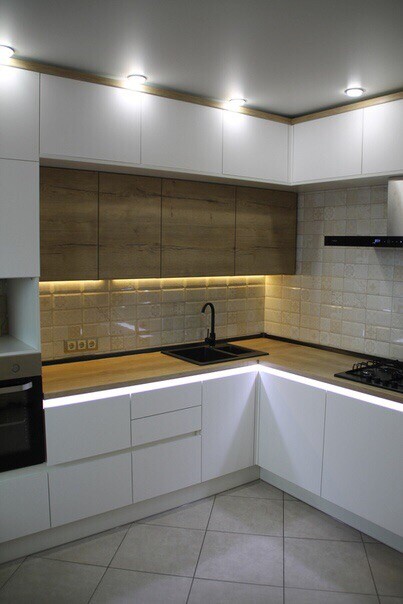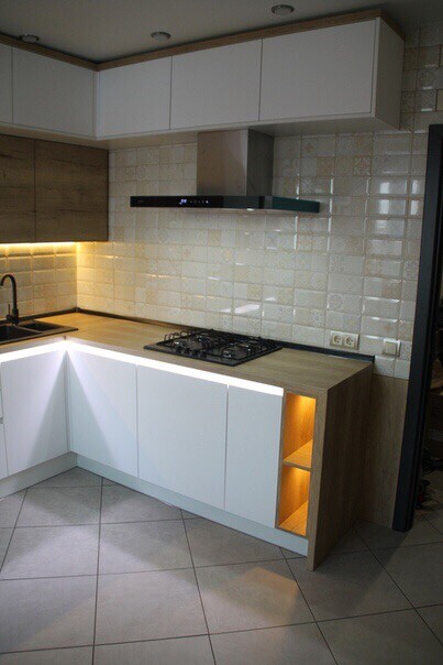 Купил квартиру в новостройке, сдали в предчистовой, значит нужно начинать с санузла и кухни. Посоветовали мне эту компанию. Понравилось стильное решение кухни с контурной подсветкой. Замерщик приехал быстро, похвалил мой вкус. Могу отметить хорошее качество мебели. Вид очень привлекательный, все поместилось на кухне